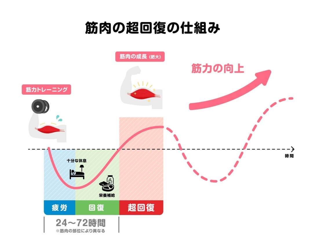 筋肉が回復する際には、適度な運動であれば、元に戻るのではなく一旦以前より強い状態になります。その強い状態で再び適度な運動を入れることでさらに強くなっていきます。そのため筋トレで「破壊と再生」が繰り返されることで筋組織が太く、強くなるのです。このような以前より強い状態になるサイクルを「超回復」といいます。