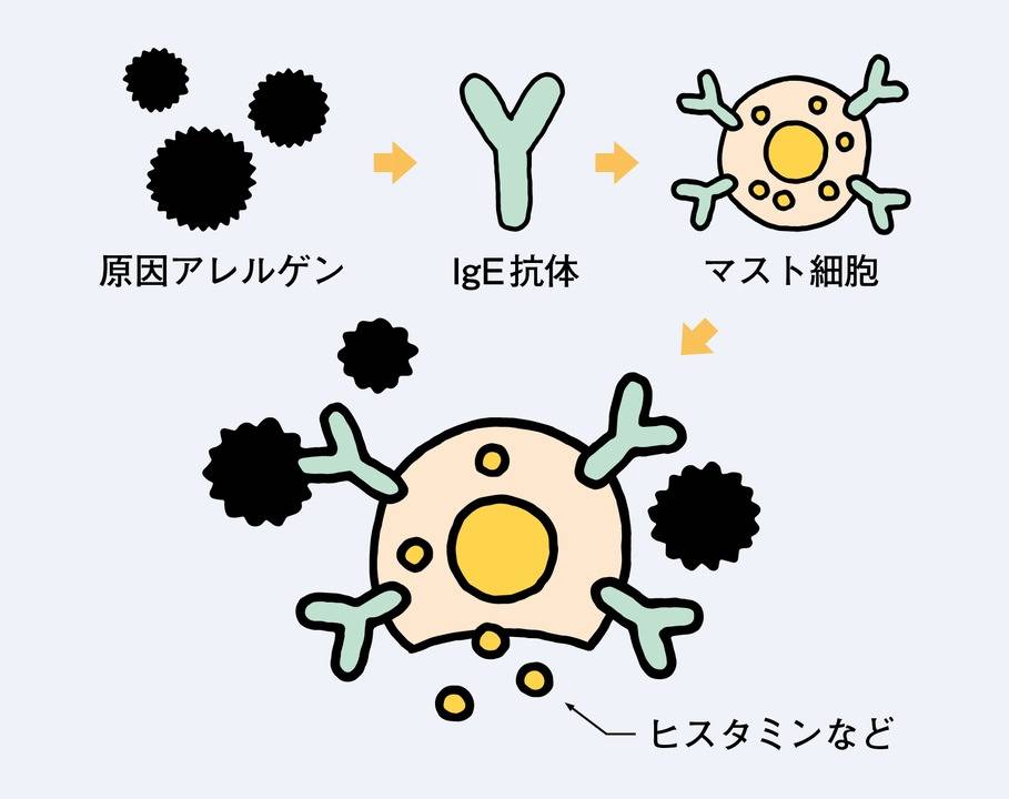 原因アレルゲンがマスト細胞やIgE抗体に結合すると、マスト細胞がヒスタミンを放出し、周囲に炎症を起こすのだ。